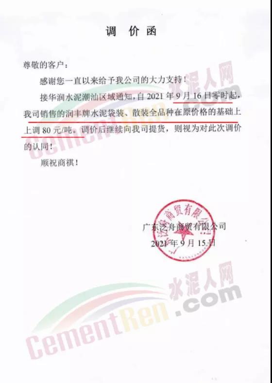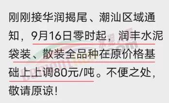 華潤(rùn)揭尾、潮汕區(qū)域通知,9月16日零時(shí)起,潤(rùn)豐水泥袋裝、散裝全品種在原價(jià)格基礎(chǔ)上上調(diào)80元/噸。