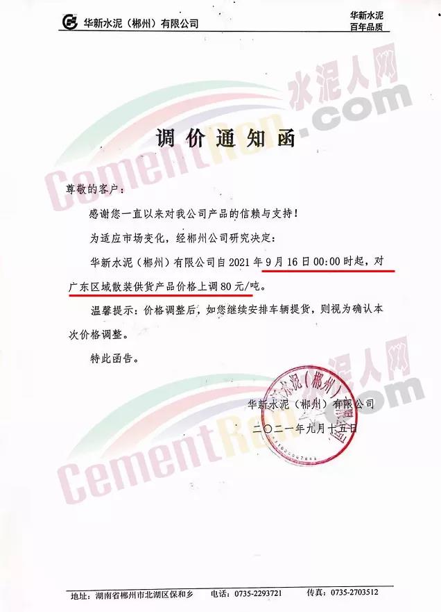 華新水泥(郴州)有限公司通知,9月16日0時(shí)起,對(duì)廣東區(qū)域散裝供貨價(jià)上調(diào)80元/噸。