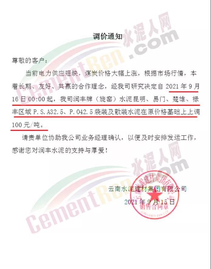 云南水泥建材集團(tuán)有限公司通知,當(dāng)前電力供應(yīng)短缺,煤炭?jī)r(jià)格大幅上漲,根據(jù)市場(chǎng)行情,本著長(zhǎng)期、友好、共贏的合作理念,經(jīng)公司研究決定自2021年9月 16日0時(shí)起,公司潤(rùn)豐牌(旋窯)水泥昆明、易門(mén)、楚雄、祿豐區(qū)域P.S.A32.5、P.042.5袋裝及散裝水泥在原價(jià)格基礎(chǔ)上上調(diào)100元/噸。