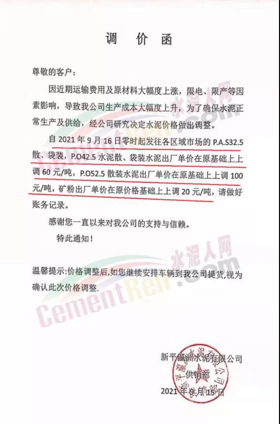 云南省玉溪市新平彝族傣族自治縣新平瀛洲水泥有限公司通知,因近期運(yùn)輸費(fèi)用及原材料大幅度上漲,限電、限產(chǎn)等因素影響,導(dǎo)致公司生產(chǎn)成本大幅度上升,為了確保水泥正常生產(chǎn)及供給,經(jīng)公司研究決定水泥價(jià)格做出調(diào)整。自2021年9月16日零時(shí)起發(fā)往各區(qū)域市場(chǎng)的P.A.S32.5散、袋裝,PO42.5水泥散、袋裝水泥出廠單價(jià)在原基礎(chǔ)上上調(diào)60元/噸,PO52.5散裝水泥出廠單價(jià)在原基礎(chǔ)上上調(diào)100元/噸,礦粉出廠單價(jià)在原價(jià)格基礎(chǔ)上上調(diào)20元/噸。