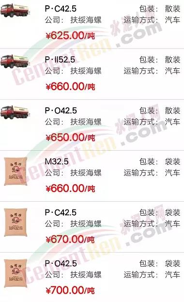 16日張家界水泥部分主流品牌全品種價(jià)格漲50元/噸,現(xiàn)主流品牌P.O42.5散裝水泥市場(chǎng)報(bào)445-500元/噸。