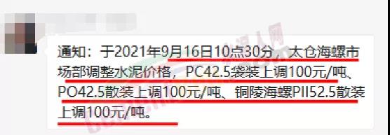 海螺市場(chǎng)部通知于2021年9月16日10點(diǎn)30分,太倉海螺市場(chǎng)部調(diào)整水泥價(jià)格,PC42.5袋裝上調(diào)100元/噸、PO42.5散裝上調(diào)100元/噸、銅陵海螺PII52.5散裝上調(diào)100元/噸。