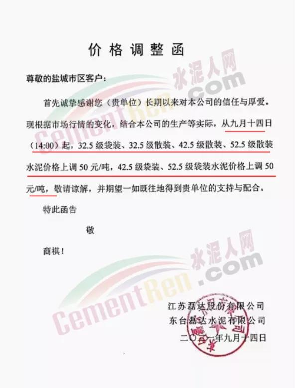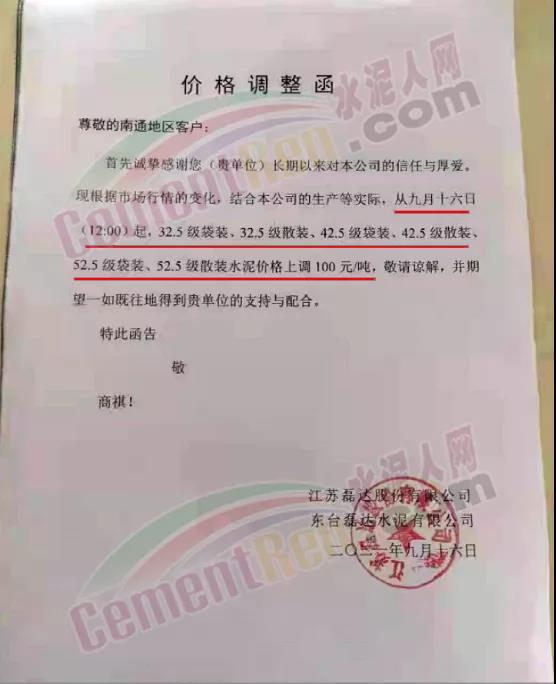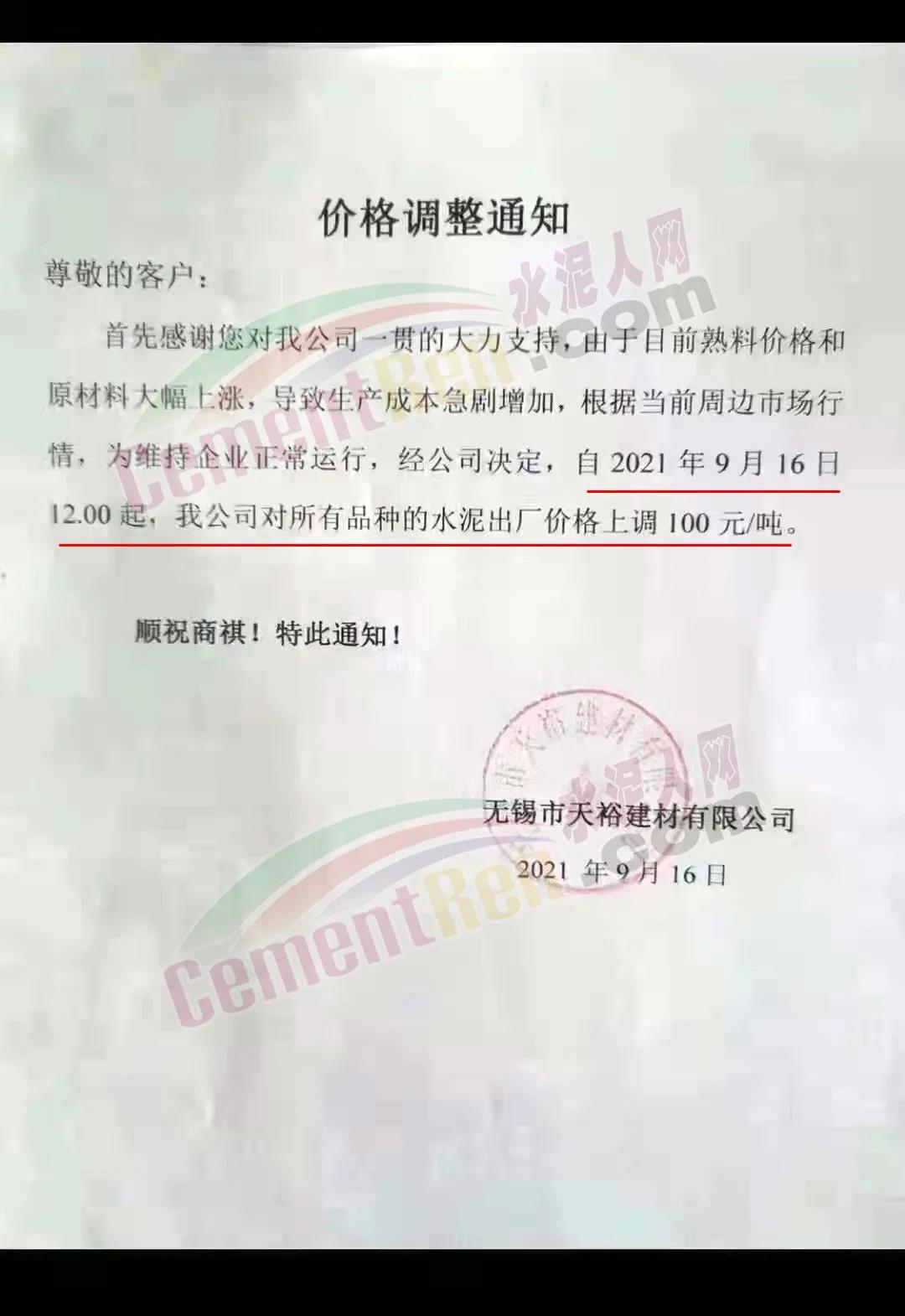 無錫市天裕建材有限公司通知,自9月16日12時(shí)起,公司對(duì)所有品種水泥出廠價(jià)上調(diào)100元/噸。