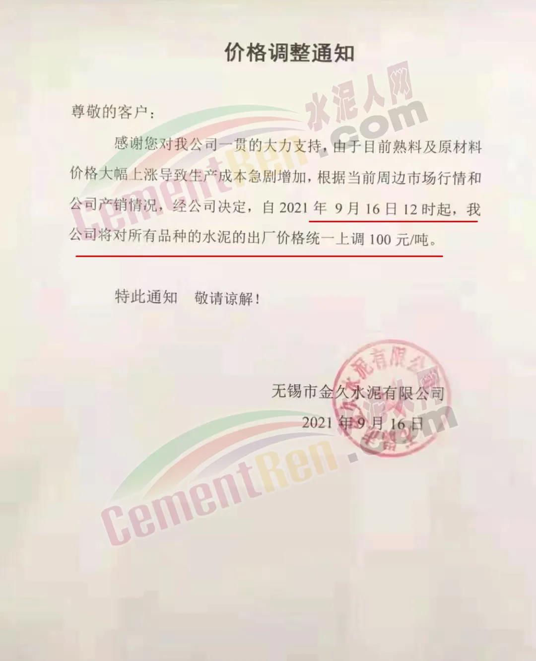 無錫金久水泥通知,由于目前熟料及原材料價(jià)格大幅上漲導(dǎo)致生產(chǎn)成本急劇增加,經(jīng)公司研究決定自9月16日12時(shí)起,公司對(duì)所有品種水泥出廠價(jià)統(tǒng)一上調(diào)100元/噸。