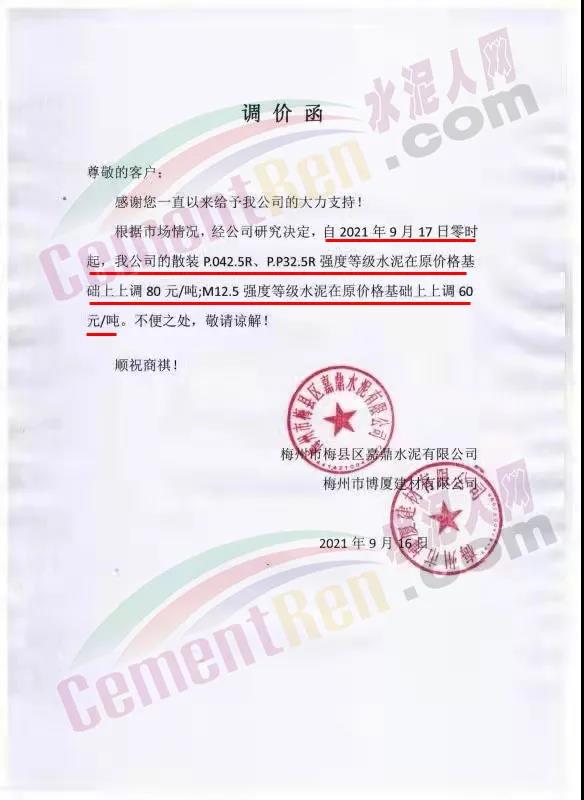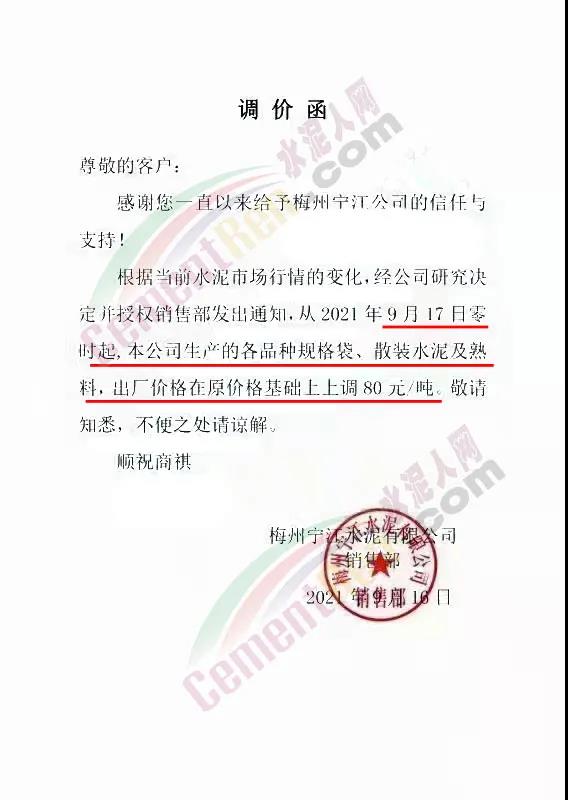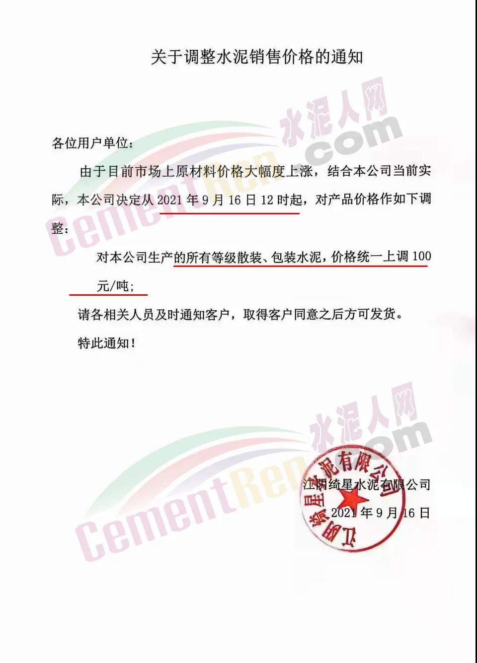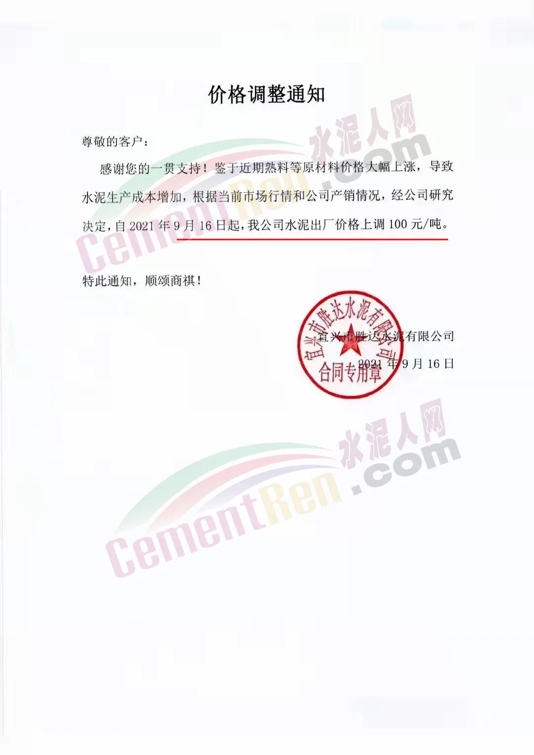 宜興市勝達(dá)水泥通知,鑒于近期熟料等原材料價(jià)格大幅上漲,導(dǎo)致水泥生產(chǎn)成本增加,根據(jù)當(dāng)前市場(chǎng)行情和公司產(chǎn)銷情況,經(jīng)公司研究決定自9月16日起,公司水泥出廠價(jià)格上調(diào)100元/噸。