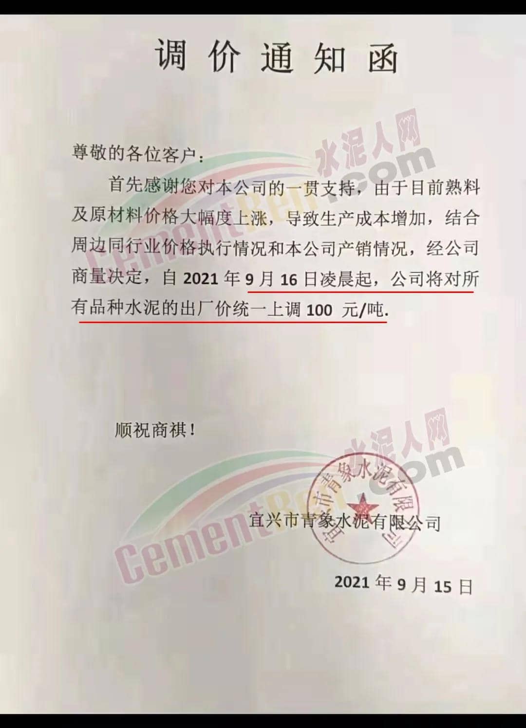 宜興市青象水泥有限公司通知,自9月16日凌晨起,公司對(duì)所有品種水泥的出廠價(jià)統(tǒng)一上調(diào)100元/噸。