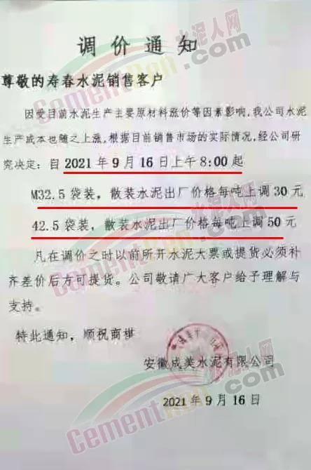 安徽成美水泥有限公司通知因受目前水泥生產(chǎn)主要原材料漲價(jià)等因素影響,公司水泥生產(chǎn)成本也隨之上漲,根據(jù)目前銷售市場(chǎng)實(shí)際情況,經(jīng)公司研究決定9月16日8時(shí)起,上調(diào)M32.5水泥價(jià)格30元/噸,42.5水泥出廠價(jià)上調(diào)50元/噸。