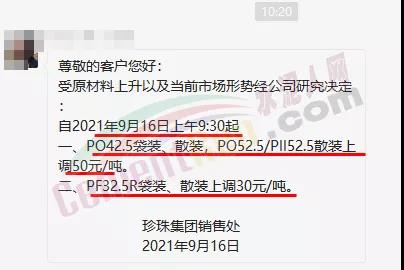 珍珠集團(tuán)銷售處通知,自9月16日起各標(biāo)號(hào)水泥上調(diào)30-50元/噸。