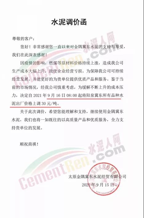 同期山西太原金隅冀東水泥經(jīng)貿(mào)有限公司通知,因疫情的影響,燃煤等原材料價(jià)格持續(xù)上漲,造成公司生產(chǎn)成本大幅上升,致使企業(yè)經(jīng)營(yíng)虧損。為保障公司可持續(xù)經(jīng)營(yíng)發(fā)展,并能更好的為貴單位提供優(yōu)質(zhì)產(chǎn)品和服務(wù)。鑒于當(dāng)前的市場(chǎng)情況,經(jīng)公司慎重考慮,為緩解不斷上升的成本壓力,決定自2021年9月16日08∶00起將陽泉冀東所有品種水泥出廠價(jià)格上調(diào)30元/噸。