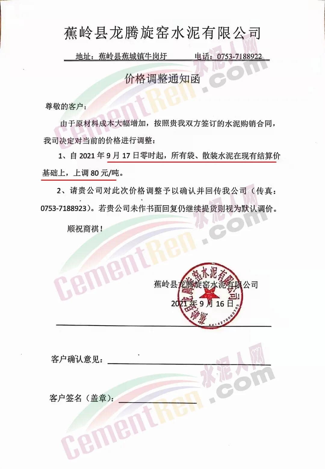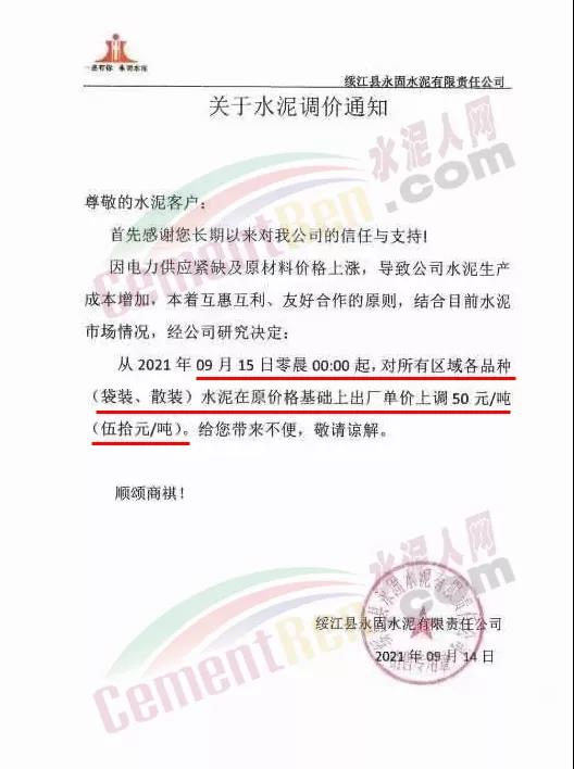 云南省昭通市綏江縣永固水泥有限責(zé)任公司通知因電力供應(yīng)緊缺及原材料價(jià)格上漲,導(dǎo)致公司水泥生產(chǎn)成本增加,結(jié)合目前水泥市場(chǎng)情況,經(jīng)公司研究決定從2021年9月15日0時(shí)起,對(duì)所有區(qū)域各品種(袋裝、散裝)水泥在原價(jià)格基礎(chǔ)上出廠單價(jià)上調(diào)50元/噸。