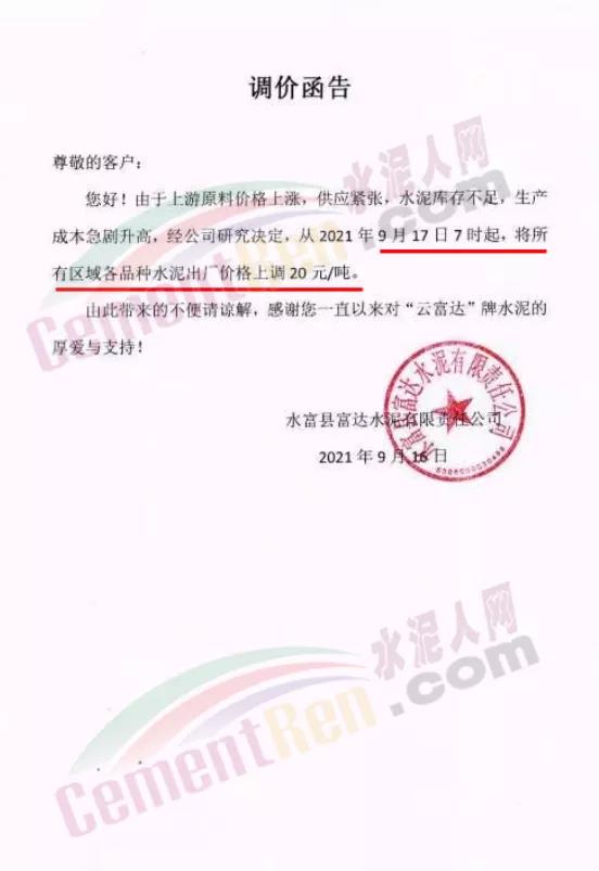 廣西壯族自治區(qū)桂林市水富縣富達(dá)水泥公司通知,由于上游原料價(jià)格上漲,供應(yīng)緊張,水泥庫存不足,生產(chǎn)成本急劇升高,經(jīng)公司研究決定,從2021年9月17日7時(shí)起,將所有區(qū)域各品種水泥出廠價(jià)格上調(diào)20元/噸。