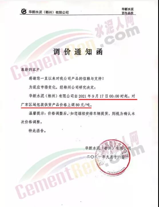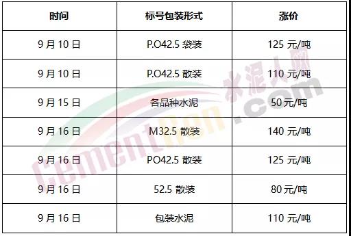 9月16日,江華海螺通知稱再次上調(diào)M32.5散裝水泥直漲140元/噸,PO42.5散裝水泥直漲125元/噸,包裝水泥上調(diào)110元/噸,52.5散裝水泥上調(diào)80元/噸。