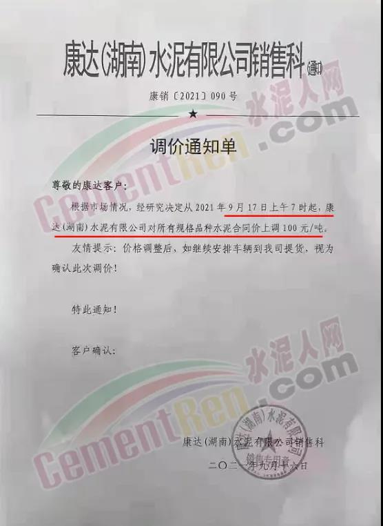 康達(dá)(湖南)水泥有限公司繼15日上調(diào)50元/噸后,再次通知9月17日7時(shí)起,公司所有規(guī)格品種水泥價(jià)格上調(diào)100元/噸。兩日內(nèi)上調(diào)150元/噸。
