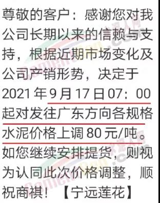 同日寧遠(yuǎn)蓮花水泥通知自9月17日7時(shí)起對(duì)發(fā)往廣東方向各規(guī)格水泥上調(diào)80元/噸。
