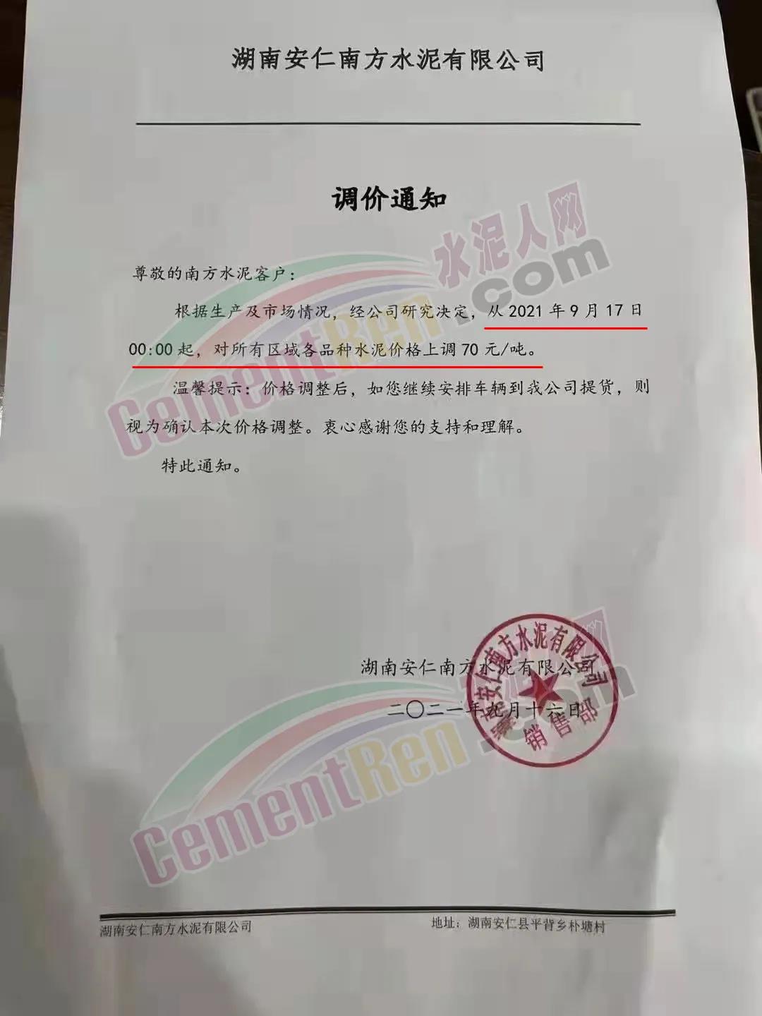 湖南安仁南方通知,9月17日起對(duì)所有區(qū)域各品種水泥價(jià)格上調(diào)70元/噸。