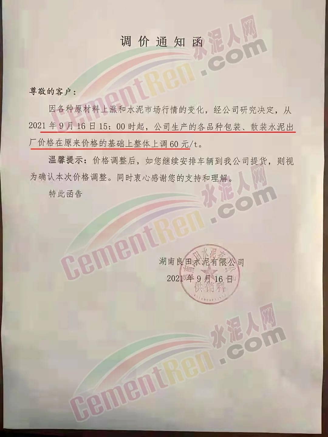 湖南良田水泥有限公司通知,自9月16日15時(shí)起,公司各品種水泥上調(diào)60元/噸。