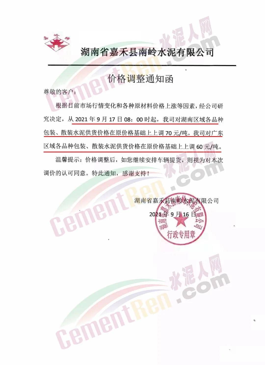 湖南嘉禾縣南嶺水泥有限公司通知,自9月17日8時(shí)起,公司對(duì)湖南區(qū)域各品種水泥上調(diào)70元/噸,對(duì)廣東地區(qū)各標(biāo)號(hào)水泥上調(diào)60元/噸。