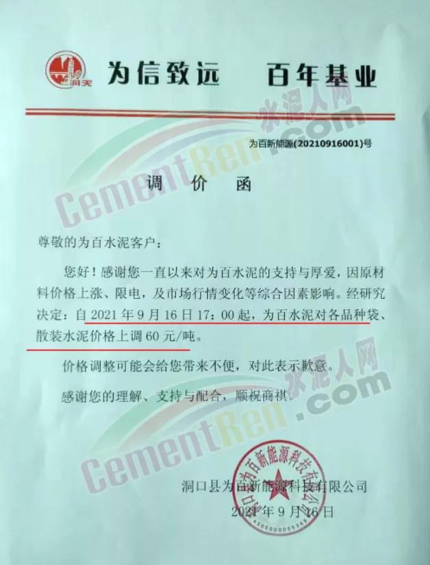 洞口縣為百水泥通知,因原材料價(jià)格上漲、限電及市場(chǎng)行情變化等綜合因素影響,經(jīng)研究決定自9月16日17時(shí)起,為百水泥各品種袋裝、散裝水泥價(jià)格上調(diào)60元/噸。
