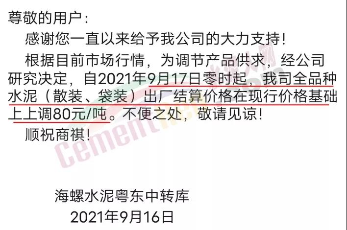 海螺水泥粵東中轉(zhuǎn)庫通知根據(jù)目前市場(chǎng)行情,為調(diào)節(jié)產(chǎn)品供求,經(jīng)公司研究決定,自2021年9月17日零時(shí)起,公司全品種水泥(散裝、袋裝)出廠結(jié)算價(jià)格在現(xiàn)行價(jià)格基礎(chǔ)上上調(diào)80元/噸。