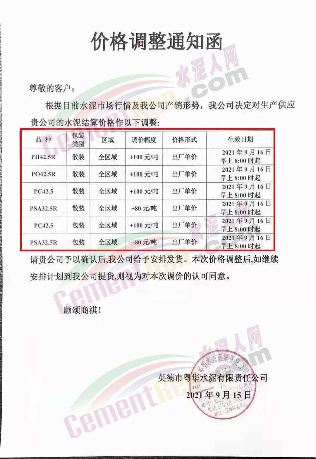 英德市粵華水泥有限責(zé)任公司通知,自9月16日早上8時(shí)起,各標(biāo)號(hào)水泥上調(diào)80-100元/噸。