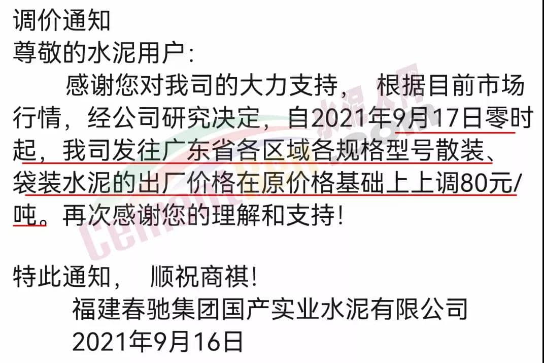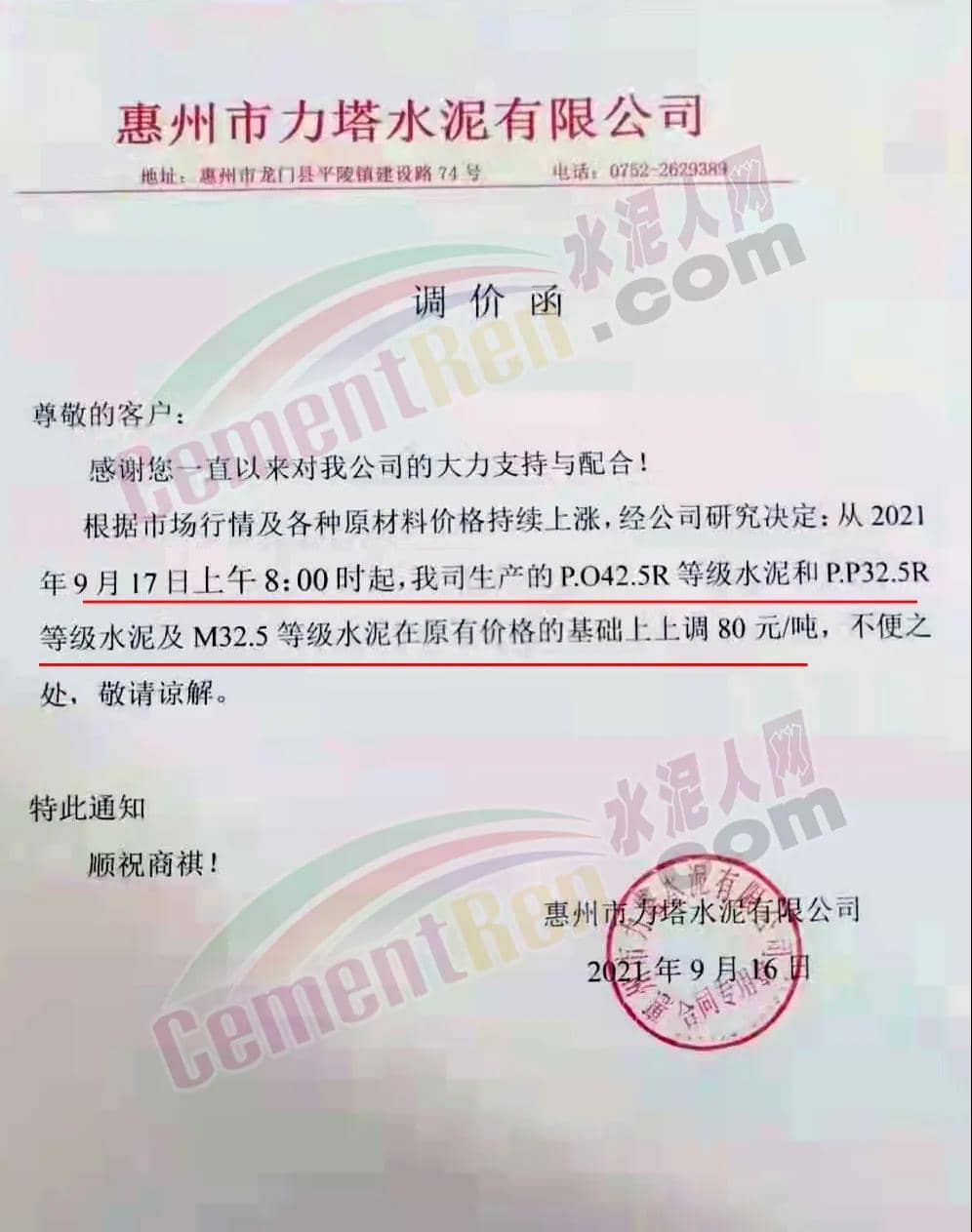 惠州市力塔水泥通知,根據(jù)市場(chǎng)行情 及各種原材料價(jià)格持續(xù)上漲,經(jīng)公司研究決定,從2021年9月17日上午8時(shí)起,公司生產(chǎn)的各標(biāo)號(hào)水泥上調(diào)80元/噸。