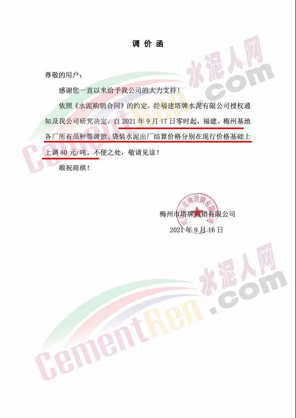 梅州市塔牌營(yíng)銷有限公司通知,9月17日零時(shí)起,福建、梅州基地各廠所有品種等級(jí)散、袋裝水泥出廠結(jié)算價(jià)上調(diào)80元/噸。