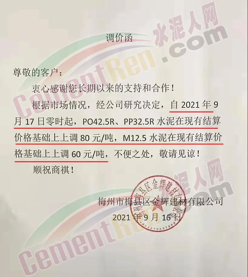 梅州市梅縣區(qū)金輝建材有限公司通知,自9月17日零時(shí)起,各標(biāo)號(hào)水泥上調(diào)60-80元/噸。