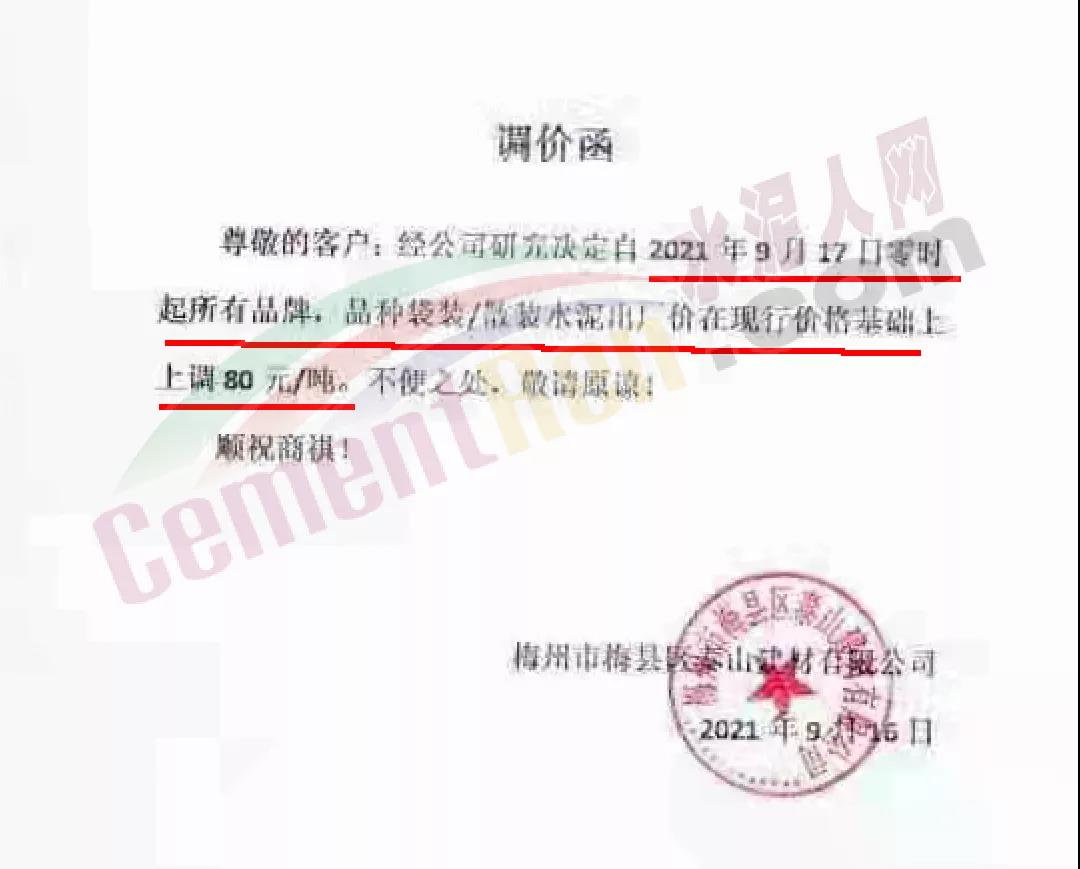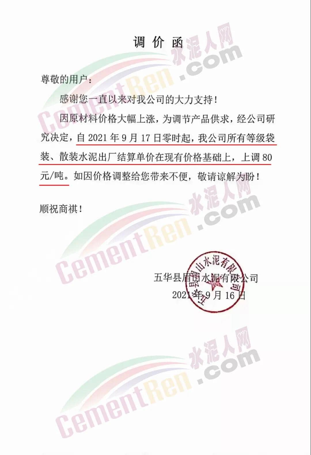 五華縣眉山水泥有限公司通知自9月17日零時(shí)起,公司所有等級(jí)水泥價(jià)格上調(diào)80元/噸。