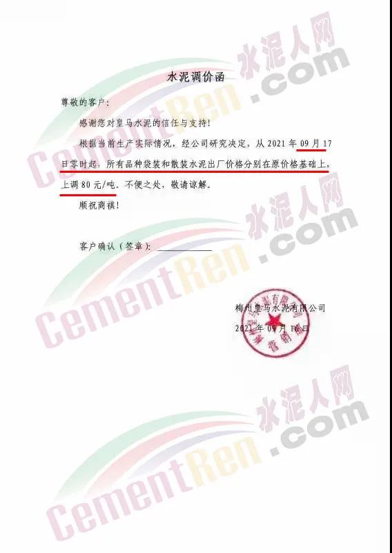 梅州皇馬水泥有限公司通知,9月17日零時(shí)起,各品種水泥價(jià)格上調(diào)80元/噸。