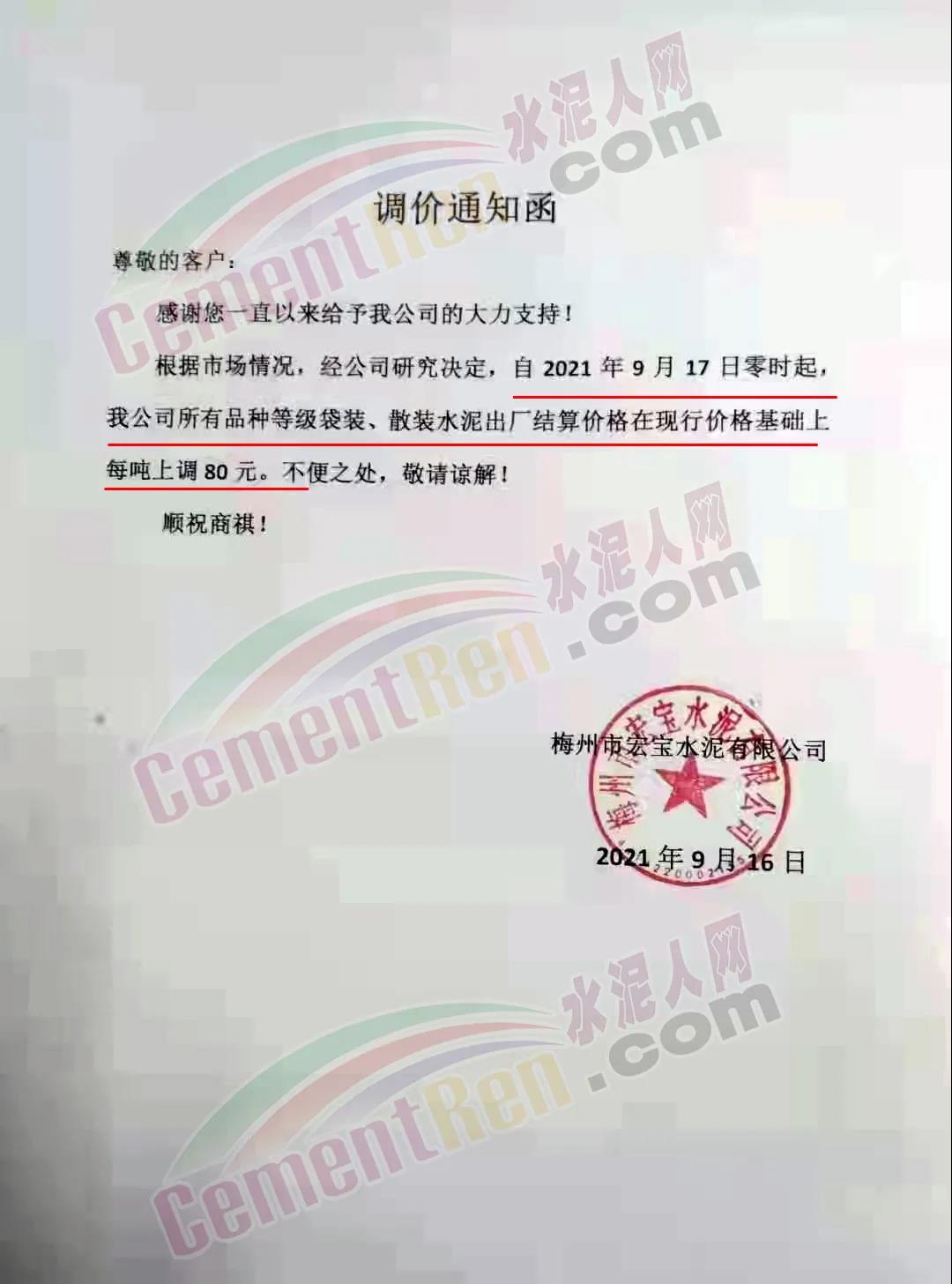 梅州市宏寶水泥有限公司通知,9月17日零時(shí)起,公司所有品種水泥上調(diào)80元/噸。