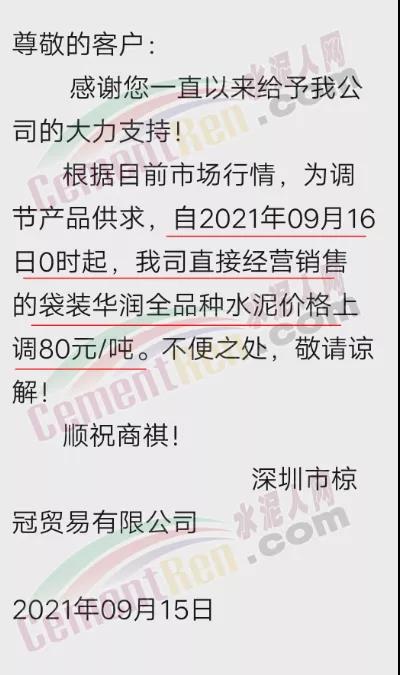 深圳市椋冠貿(mào)易有限公司通知,9月16日起,公司直接經(jīng)營(yíng)銷售的袋裝華潤(rùn)全品種水泥價(jià)格上調(diào)80元/噸。