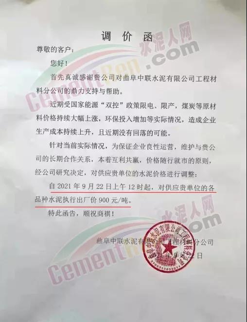 近日,曲阜中聯(lián)水泥有限公司工程材料分公司通知,近期受國(guó)家能源“雙控”政策限電、限產(chǎn),煤炭等原材料價(jià)格持續(xù)大幅上漲,環(huán)保投入增加等實(shí)際情況,造成企業(yè)生產(chǎn)成本持續(xù)上升,且近期沒(méi)有回落的可能。針對(duì)當(dāng)前實(shí)際情況,為保證企業(yè)良性運(yùn)營(yíng),經(jīng)公司研究決定,自2021年9月22日上午12時(shí)起,各品種水泥執(zhí)行出廠價(jià)900元/噸。