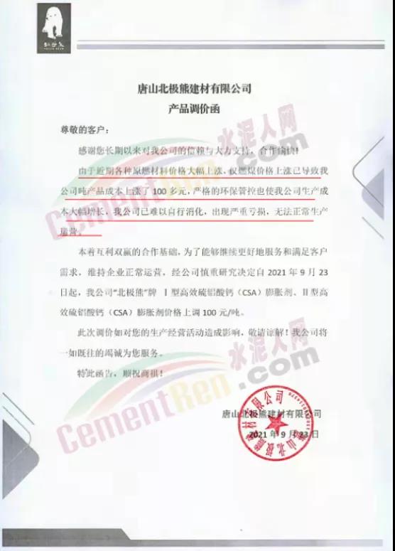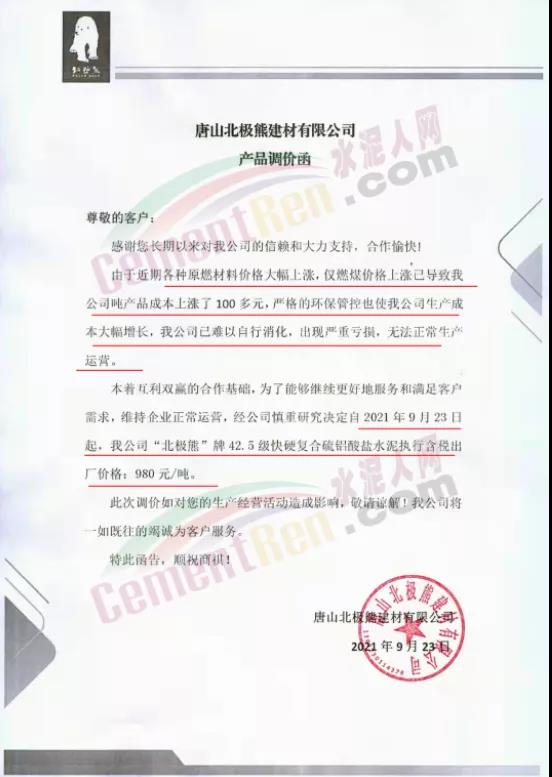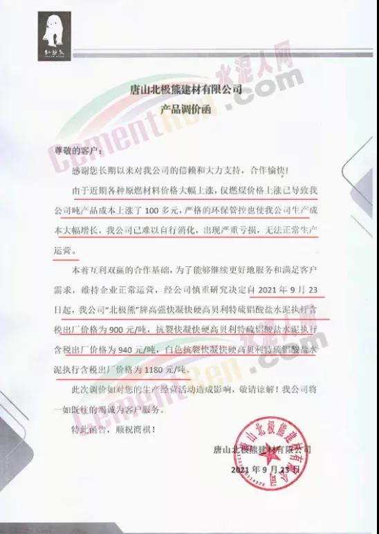 特種水泥方面,不僅山東區(qū)域,河北區(qū)域也有多家特種水泥企業(yè)上調(diào)水泥價(jià)格。唐山北極熊建材有限公司連發(fā)三份產(chǎn)品調(diào)價(jià)函稱,由于近期各種原燃材料價(jià)格大幅上漲,僅燃煤價(jià)格上漲已導(dǎo)致公司噸產(chǎn)品成本上漲了100多元,為了能夠維續(xù)更好地服務(wù)和滿足客戶需求,維持企業(yè)正常運(yùn)營(yíng)。