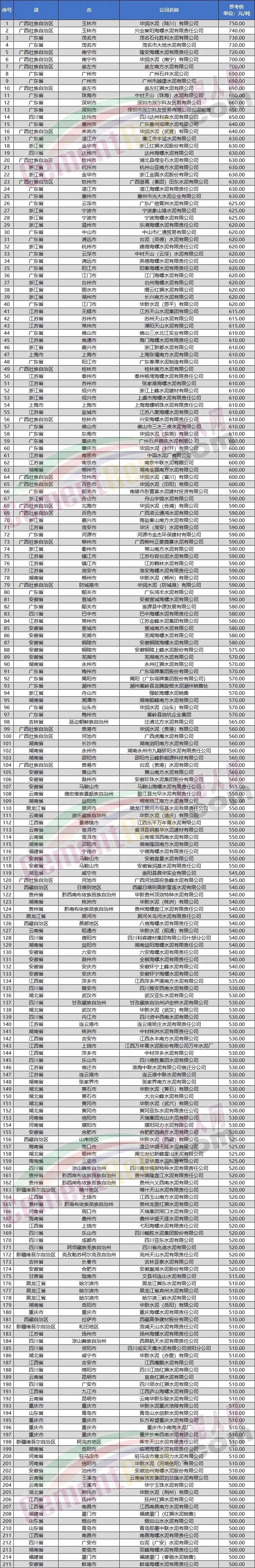 ?水泥人網(wǎng)信息中心重點(diǎn)監(jiān)管的千余家水泥企業(yè)水泥價(jià)格數(shù)據(jù)顯示,有216家企業(yè)出廠參考價(jià)500元/噸及以上,有近一半的企業(yè)到位價(jià)在500元/噸及以上。