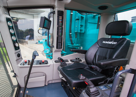 4.人文關(guān)懷,安全保障。司機(jī)室裝有冷暖空調(diào)、正壓系統(tǒng)、新風(fēng)系統(tǒng)等,讓操作手遠(yuǎn)離職業(yè)病傷害,此外,鉆機(jī)上還安裝了急停按鈕、滅火器等,充分保障使用者的人身安全。