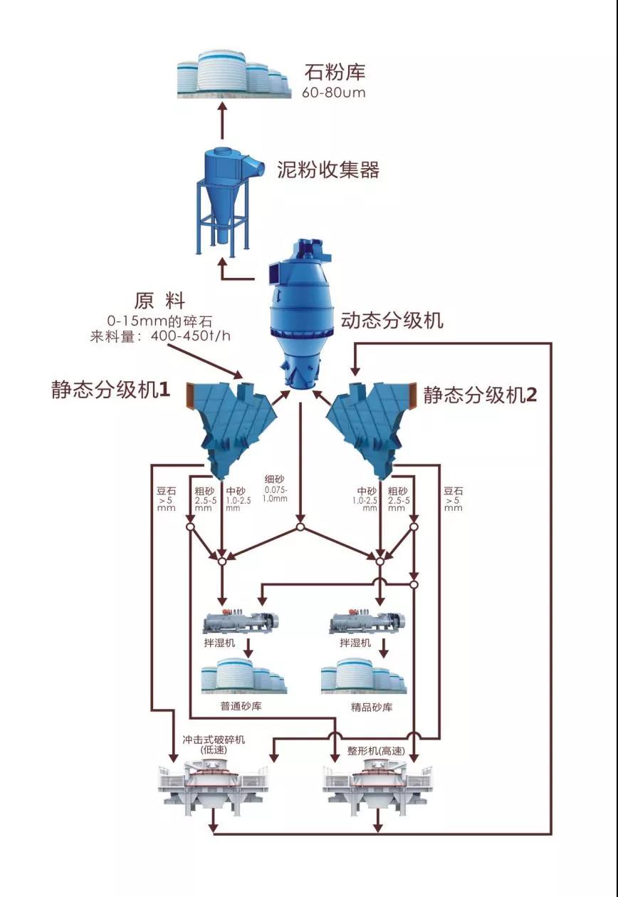 經(jīng)過破碎、整形后的物料,通過輸送設(shè)備送入【靜態(tài)分級(jí)機(jī)2】,分離出豆石、粗砂、中砂。細(xì)砂和石粉隨氣流進(jìn)入共用的動(dòng)態(tài)分級(jí)機(jī)分離出細(xì)砂、石粉、超細(xì)粉。按設(shè)計(jì)的配料要求,將粗砂、中砂、細(xì)砂按比例進(jìn)行配制,然后送入【拌濕機(jī)2】,添加適量的水進(jìn)行拌濕,最后送入精品砂庫或砂堆中, 多余的粗料按不同的粒徑再分別返回到制砂機(jī)、整形機(jī)分別進(jìn)行破碎、整形,從而形成閉路生產(chǎn)。