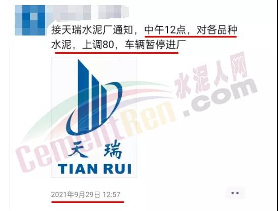 同日有經(jīng)銷商通知,受國家煤價上漲,限電,錯峰停產(chǎn),水泥漲協(xié)同會定在10月8日召開,漲價幅度不低于80元/噸,大家有需求,抓緊提前拉運備存,不要錯過最佳時機。