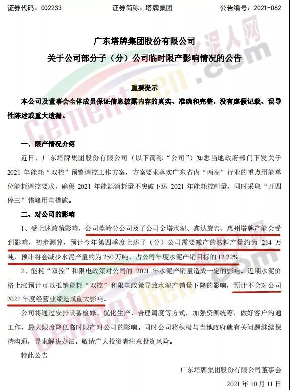 10月11日塔牌集團稱,近日,廣東塔牌集團股份有限公司知悉當(dāng)?shù)卣块T下發(fā)關(guān)于2021 年能耗“雙控”預(yù)警調(diào)控工作方案,方案要求落實廣東省內(nèi)“兩高”行業(yè)的重點用能單位能耗調(diào)控要求,確保2021年能源消耗量不突破下達2021年能耗控制量,同時采取“開四停三”錯峰用電措施。
