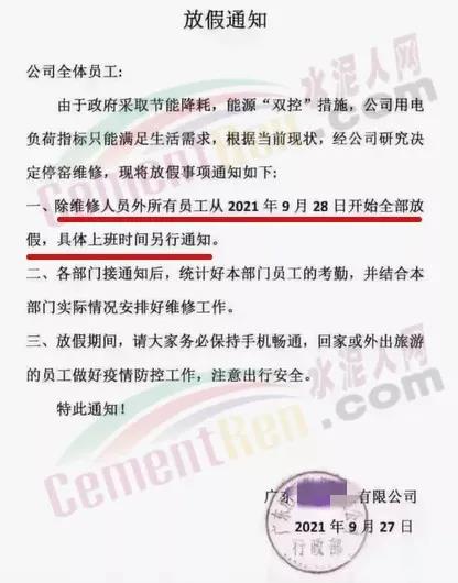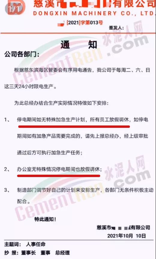 同日,遼寧省遼陽市工信局發(fā)布通知要求自2021年10月9日8時起,對水泥行業(yè)8戶熟料企業(yè)、11條熟料生產(chǎn)實施有序用電措施,期間水泥熟料生產(chǎn)停止用電,有序用電時間預(yù)計不低于15天,結(jié)束時間另行通知。同時要求對擅自啟動水泥熟料生產(chǎn)用電的企業(yè),要責(zé)令改正,情節(jié)嚴重的停止供電。