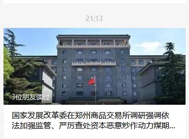 21:13分《國(guó)家發(fā)展改革委在鄭州商品交易所調(diào)研強(qiáng)調(diào)依法加強(qiáng)監(jiān)管、嚴(yán)厲查處資本惡意炒作動(dòng)力煤期貨》提到,發(fā)改委將嚴(yán)厲查處資本惡意炒作動(dòng)力煤期貨。