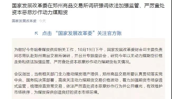 據(jù)了解,10月19日下午,國(guó)家發(fā)展改革委財(cái)金司主要負(fù)責(zé)同志帶隊(duì)赴鄭州商品交易所調(diào)研,并召開(kāi)專題座談會(huì),研究今年以來(lái)動(dòng)力煤期貨價(jià)格走勢(shì)和依法加強(qiáng)監(jiān)管、嚴(yán)厲查處資本惡意炒作動(dòng)力煤期貨有關(guān)情況。