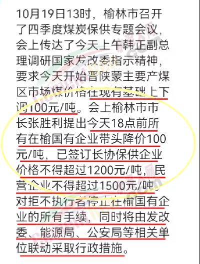 10月19日13時(shí),榆林市召開(kāi)了四季度煤炭保供專題會(huì)議,會(huì)上傳達(dá)了當(dāng)日上午韓正副總理調(diào)研國(guó)家發(fā)改委指示精神,要求晉陜蒙主要產(chǎn)煤區(qū)市場(chǎng)煤價(jià)格在現(xiàn)有基礎(chǔ)上下調(diào)100元/噸。會(huì)上榆林市市長(zhǎng)張勝利提出19日18點(diǎn)前所有在榆國(guó)有企業(yè)帶頭降價(jià)100元/噸,已簽訂長(zhǎng)協(xié)保供企業(yè)價(jià)格不得超過(guò)1200元/噸,民營(yíng)企業(yè)不得超過(guò)1500元/噸。對(duì)拒不執(zhí)行者停止在榆國(guó)有企業(yè)的所有手續(xù),同時(shí)將由發(fā)改委、能源局、公安局等相關(guān)單位聯(lián)動(dòng)采取行政措施。