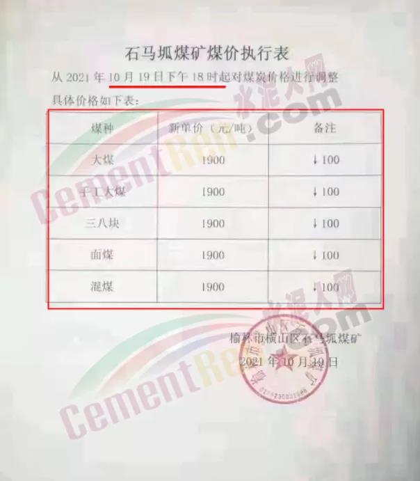 當(dāng)日,榆林市橫山區(qū)石馬坬煤礦通知從2021年10月19日下午18時(shí)起對(duì)煤炭?jī)r(jià)格下調(diào)100元/噸,新單報(bào)價(jià)1900元/噸。