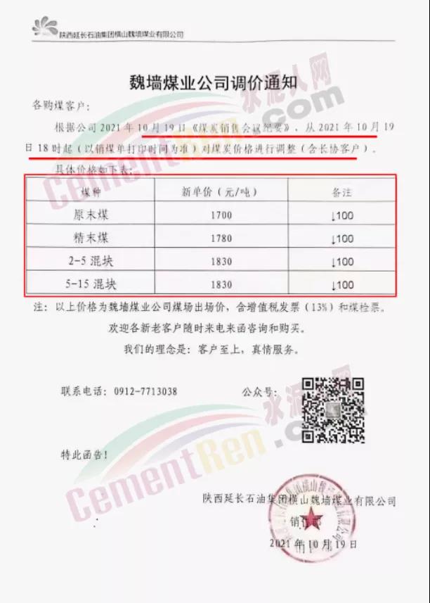 陜西延長(zhǎng)石油集團(tuán)橫山魏墻煤業(yè)有限公司通知根據(jù)公司2021年10月19日《煤炭銷售會(huì)議紀(jì)要》,從10月19日18時(shí)起對(duì)煤炭?jī)r(jià)格下調(diào)100元/噸。煤價(jià)下調(diào)后報(bào)價(jià)1700-1830元/噸。