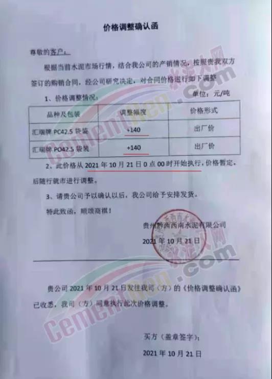 貴州黔西西南水泥通知根據(jù)當(dāng)前水泥市場(chǎng)行情 ,結(jié)合公司的產(chǎn)銷情況,經(jīng)公司研究決定自10月21日0時(shí)起對(duì)合同價(jià)格(出廠價(jià))上調(diào)140元/噸。