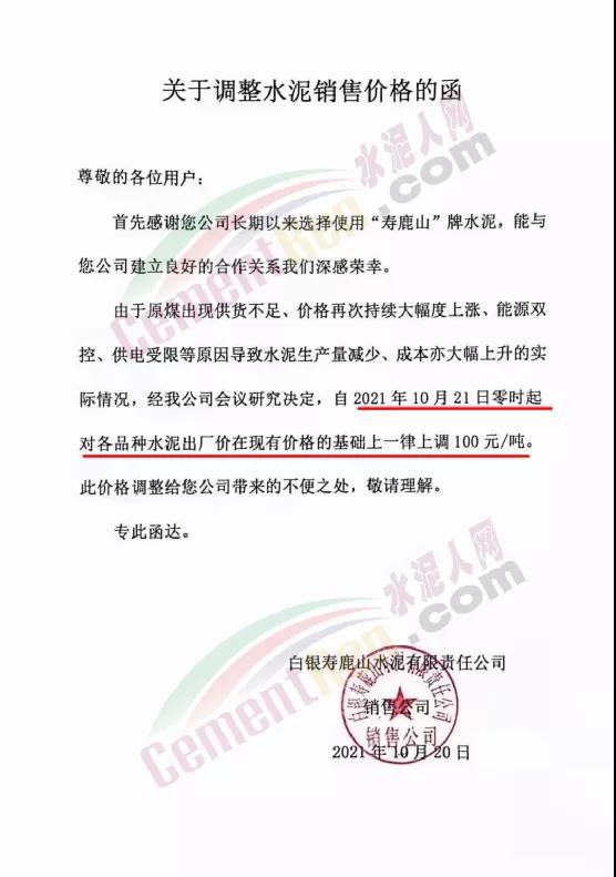 甘肅白銀壽鹿山水泥有限責(zé)任公司通知由于原煤出現(xiàn)供貨不足、價(jià)格再次持續(xù)大幅度上漲、能源雙控、供電受限等原因?qū)е滤嗌a(chǎn)量減少、成本亦大幅上升的實(shí)際情況,經(jīng)公司會(huì)議研究決定,自2021年10月21日零時(shí)起對(duì)各品種水泥出廠價(jià)在現(xiàn)有價(jià)格的基礎(chǔ)上一律上調(diào)100元/噸。