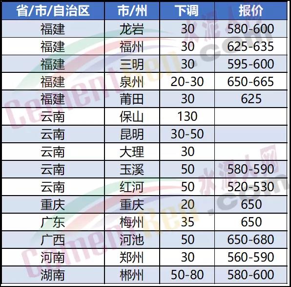 水泥人網(wǎng)通訊員消息,近期福建、云南、湖南省內(nèi)多區(qū)域水泥價格下跌30-80元/噸。