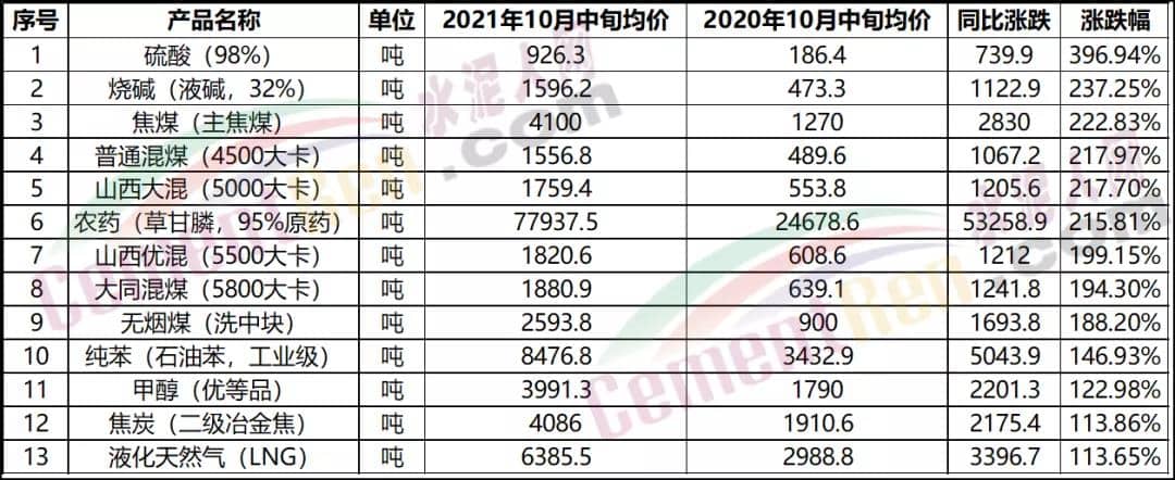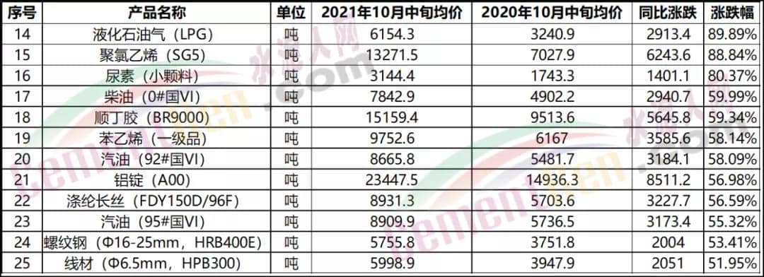 據(jù)國家統(tǒng)計(jì)局官網(wǎng)公布的全國流通領(lǐng)域9大類50種重要生產(chǎn)資料市場(chǎng)價(jià)格的監(jiān)測(cè)數(shù)據(jù)顯示,2021年10月中旬同比2020年10月中旬47種產(chǎn)品價(jià)格上漲,3種下降。其中13種產(chǎn)品漲幅在100%以上,12種產(chǎn)品漲幅在50%~90%之間。