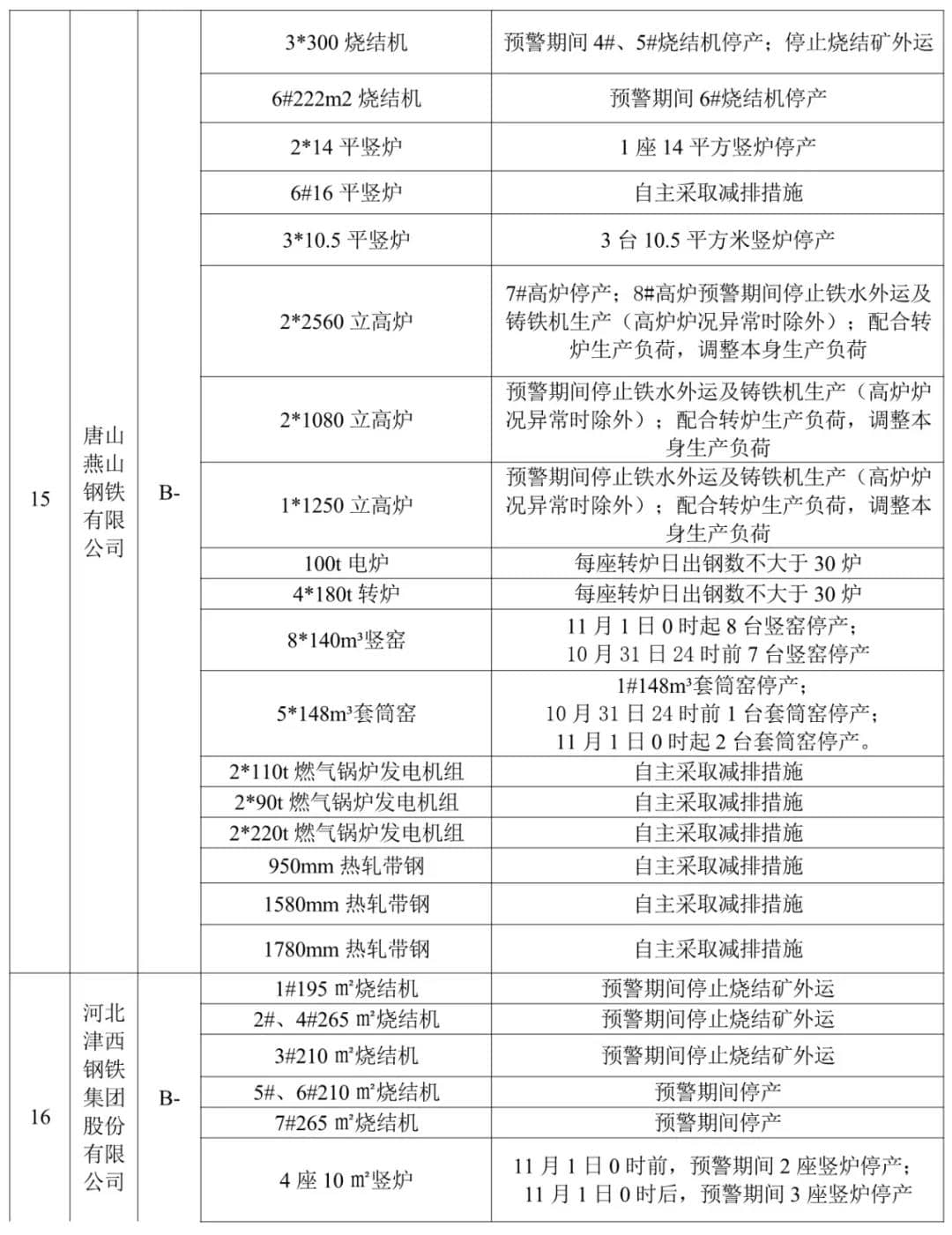 3.水泥熟料企業(yè)(特種水泥除外)。冀東啟新、冀東三友、冀東灤州、冀東唐山分公司、泓泰水泥自主減排;飛龍水泥、燕東水泥、燕南水泥、曙光強興水泥、磐石水泥、圣龍水泥、耀東水泥、弘也水泥旋窯實施生產(chǎn)調(diào)控。