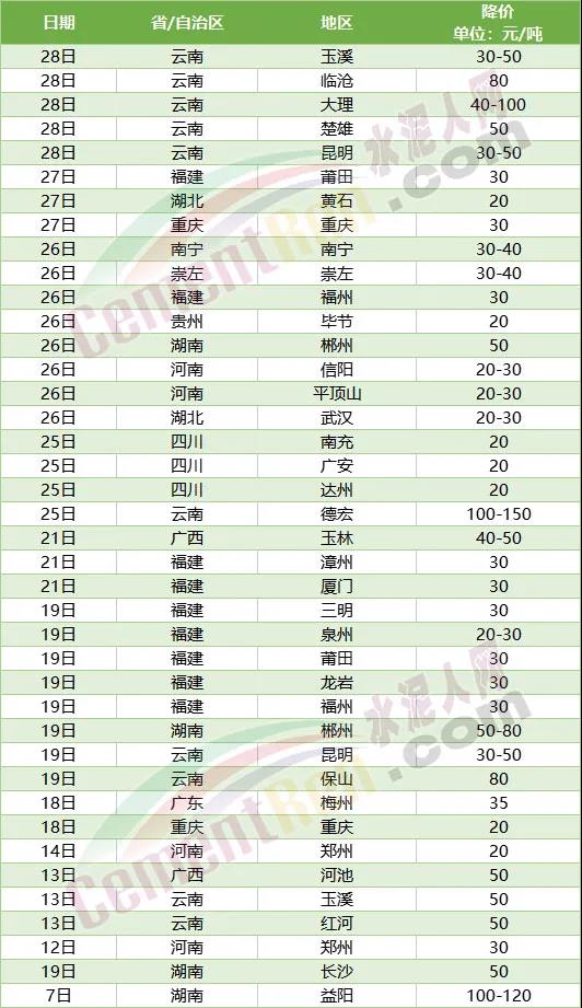 福建省內(nèi)福州、莆田等區(qū)域已經(jīng)連續(xù)兩次下調(diào)水泥價(jià)格,累計(jì)下調(diào)60元/噸。重慶兩次累計(jì)下調(diào)50元/噸。
